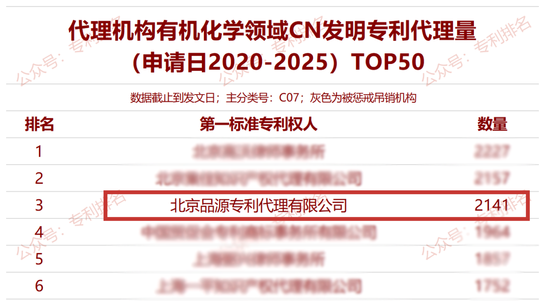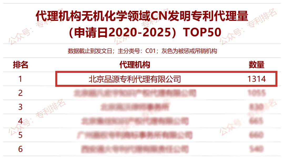 近日,依据Himmpat,专利排名公众号先后发布了“代理机构无机化学领域CN发明专利代理量(申请日2020-2025)TOP50”榜单、“代理机构有机化学领域CN发明专利代理量(申请日2020-2025)TOP50”榜单和“代理机构高分子化合物领域CN发明专利代理量(申请日2020-2025)TOP50”榜单。 在“代理机构无机化学领域CN发明专利代理量(申请日2020-2025)TOP50”榜单中,品源知识产权以1314件的发明专利代理量成功位列榜首,全国第一。在“代理机构有机化学领域CN发明专利代理量(申请日2020-2025)TOP50”榜单中,品源知识产权以2141件的发明专利代理量位列全国第三名;在“代理机构高分子化合物领域CN发明专利代理量(申请日2020-2025)TOP50”榜单中,品源知识产权以2001件的发明专利代理量仍位列全国第三名;