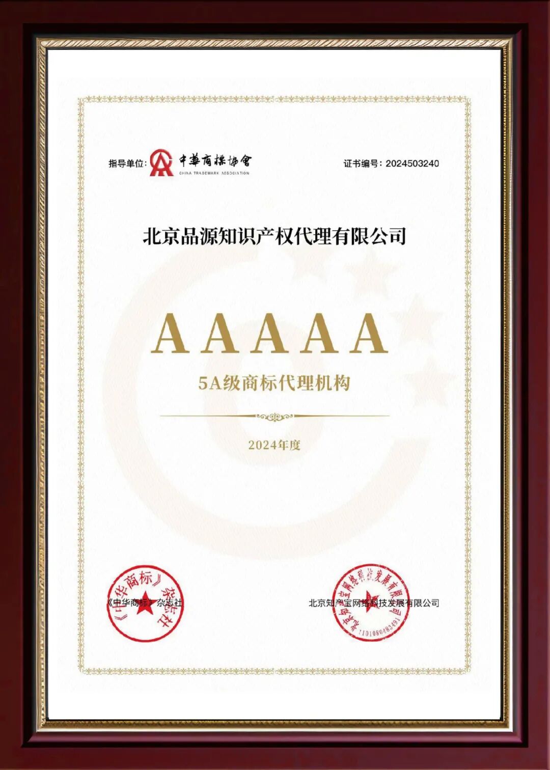 北京品源知识产权代理有限公司凭借卓越的专业实力与优质的服务表现,再度获评600强之5A级商标代理机构。